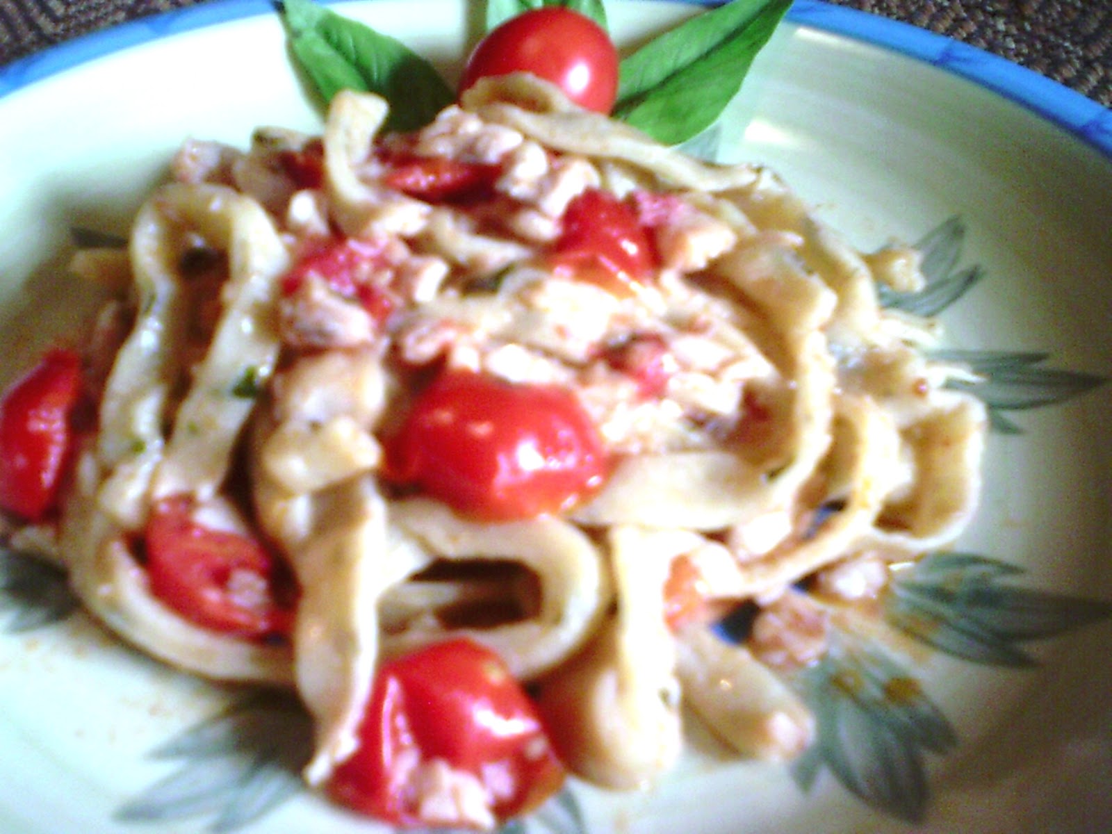 Volevo proporre una preparazione dove gli ingredienti indicati fossero l'anima del piatto e non un semplice elemento decorativo o di secondo piano. La mia scelta,. quindi, è caduta su questo piatto che vede la farina ed il basilico parte essenziale per la preparazione degli scialatielli, ed il pomodoro,unito al pesce del golfo, formare un meraviglioso condimento per questo splendido piatto.Gli scialatielli sono un formato di pasta fresca usato nella cucina Campana. Fu lo chef Enrico Cosentino, negli anni 70, ad Amalfi, che li ideò. L'impasto è composto da farina, uovo, pecorino grattugiato, basilico fresco tritato, olio EVO, latte, sale, sono tradizionalmente fatti a mano, ma si trovano in commercio preparazioni di tipo industriale. Sono delle listarelle Più corte degli spaghetti, di sezione rettangolare, una via di mezzo tra le fettuccine e le tagliatelle. La loro forma e dimensione è spiccatamente irregolare a causa della lavorazione totalmente manuale.